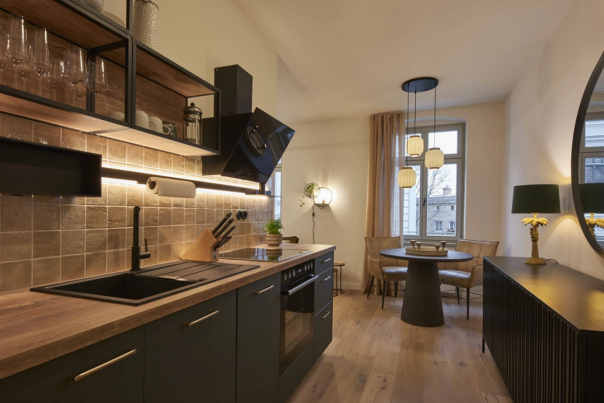 Unser Komfort Plus-Appartement bietet viel Platz für maximal vier Personen. Ob Familie oder Freunde – versammeln Sie sich in der komplett eingerichteten Küche am großen Esstisch und lassen Sie den Tag in Görlitz bei einem gemeinsamen Abendessen Revue passieren.